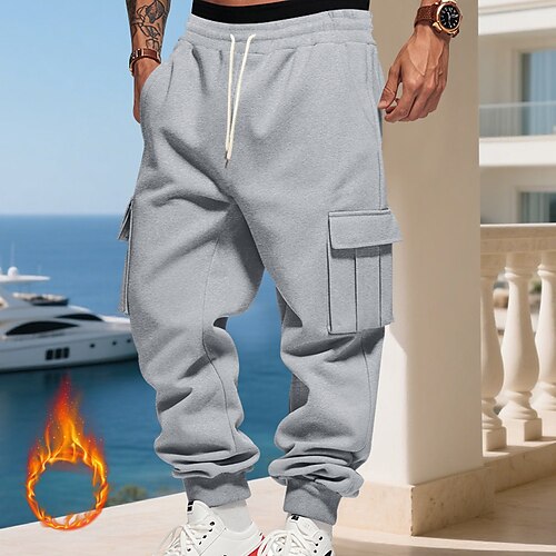 Herren Jogginghose Fleecehose Winterhose Cargo-Jogginghose Kordelzug Tasche Elastischer Bund Einfach Komfort Warm Sport im Freien Täglich Mode Lässig Schwarz Weiß Mikroelastisch