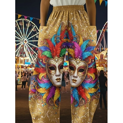 Karnevalshose für Damen, weit geschnitten, im Vintage- und Ethno-Stil, lange Hose mit hohem Bund, Grafikprint, Kordelzug, Tasche, elastischem Bund, bequem, atmungsaktiv, dehnbar, lässig, für jeden Tag