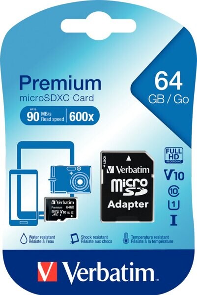 Verbatim microSDXC Speicherkarte, 64 GB, Premium, Class 10, U1, UHS-I 45MB/s, 300x, Adapter