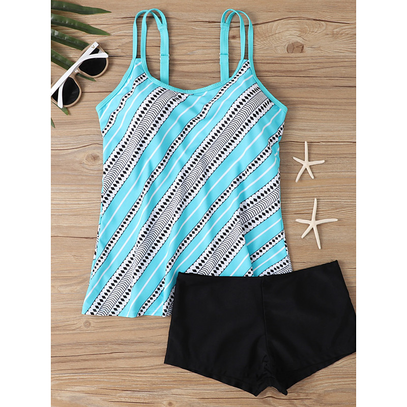 Women's Tankini 2 Piece Swimsuit Palm Shorts Tummy Control High Waist Slim Backless Vacation Beach Wear Floral Color Block U Neck Sleeveless Bathing Suits