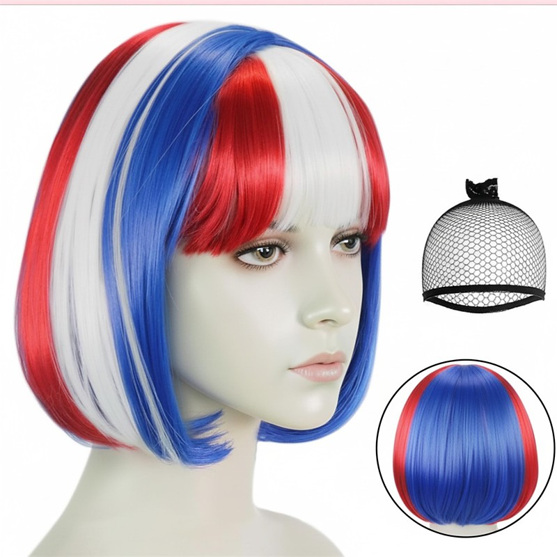 American 250 Blue Red White Wig with Bangs for Women Girls 4th of July Short Bob Wigs Fourth of July Party Heat Resistant Synthetic Wig