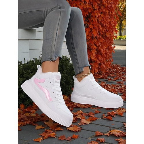 scarpe da ginnastica bianche da donna foderate in pelliccia - scarpe invernali calde e casual con lacci, eleganti scarpe da ginnastica con plateau per streetwear, viaggi e outfit quotidiani