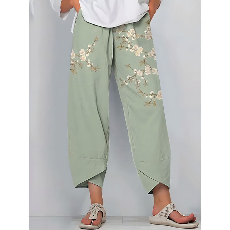 Women's Wide Leg Chinos Baggy Pants Vintage Basic Casual Ankle-Length High Waist Floral Graphic Drawstring Patchwork Printing Breathable Inelastic Outdoor Vacation Street Yellow Blue Green Beige