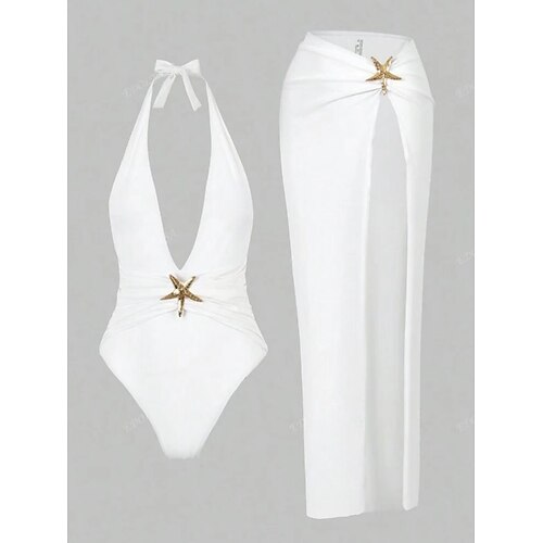 Costume da bagno 2 pezzi bikini da donna slip slim senza schienale per vacanze in spiaggia colore solido scollo a halter senza maniche