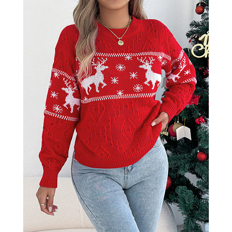 Women's Sweater Pullover Streetwear Casual Animal Crew Neck Knitted Print Long Sleeve Regular Tops Knit Daily Holiday Going out Red Green Fall Winter