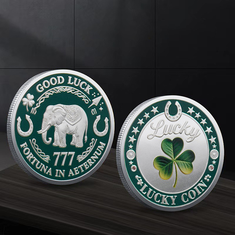 St. Patrick's Day Lucky Challenge Coin with Shamrock and Elephant Design, Good Luck Gift with 777 Symbols, Pocket Amulet for Protection and Fortune, Collectible Coin with Acrylic Case
