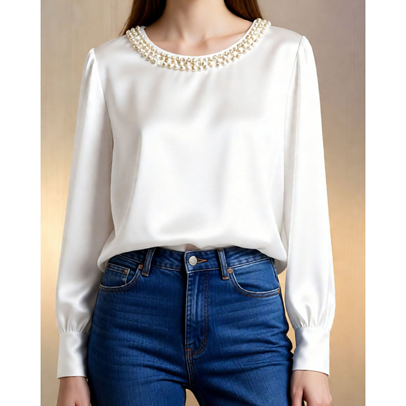 Women's Blouse Dressy Tops Solid Color Plain Elegant Ladies Stylish Long Sleeve Crew Neck Regular Tops Daily Work Going out Ruched Patchwork Beaded Black White Green Apricot Summer Spring