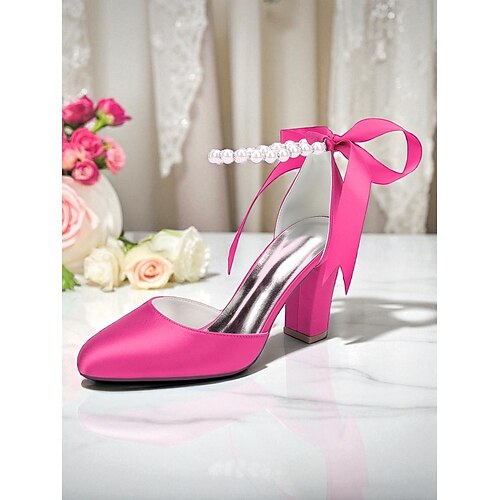 Damen Pumps aus orangefarbenem Satin mit Blockabsatz und Perle Knöchelriemen aus Band – elegante High Heels mit spitzer Spitze für Hochzeiten, Partys Abendveranstaltungen