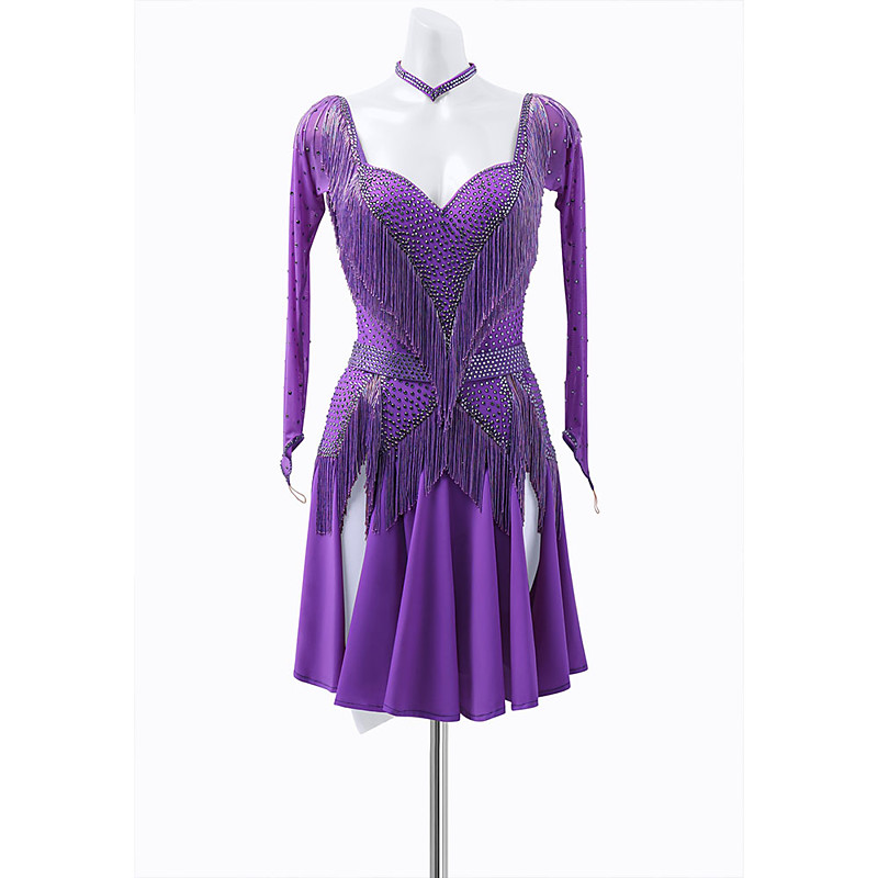 Dazzling Purple Latin Dance Dress for Women - Long Mesh Sleeves, Rhinestone Sweetheart Bodice, Extensive Fringe, Asymmetrical Skirt Matching Choker Rumba Salsa Gown