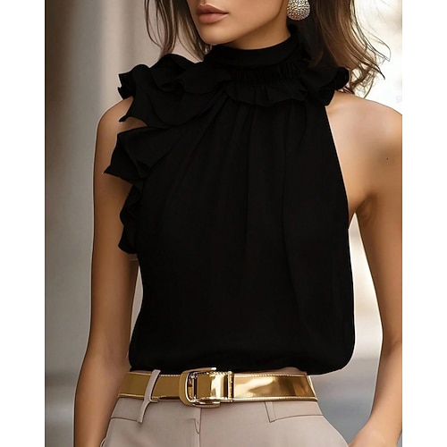 Damen T Shirt Tank Top Einfarbig Elegant Mode Ärmellos Hoher Ausschnitt Normale Oberteile Täglich Ausgehen Wochenende Rüsche Schwarz Rote Braun Khaki Sommer Frühling