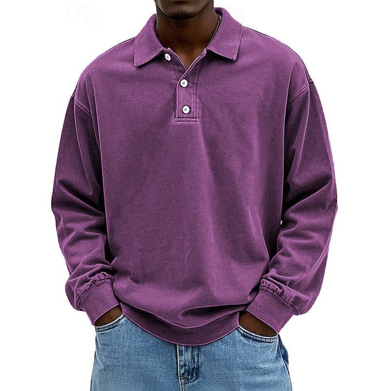 Men's Polo Business Casual Lapel Long Sleeve Comfortable Office Solid / Plain Color Buttons Spring Summer Regular Fit dark brown Robin's Egg Blue Violet Black Light Green Pink Polo