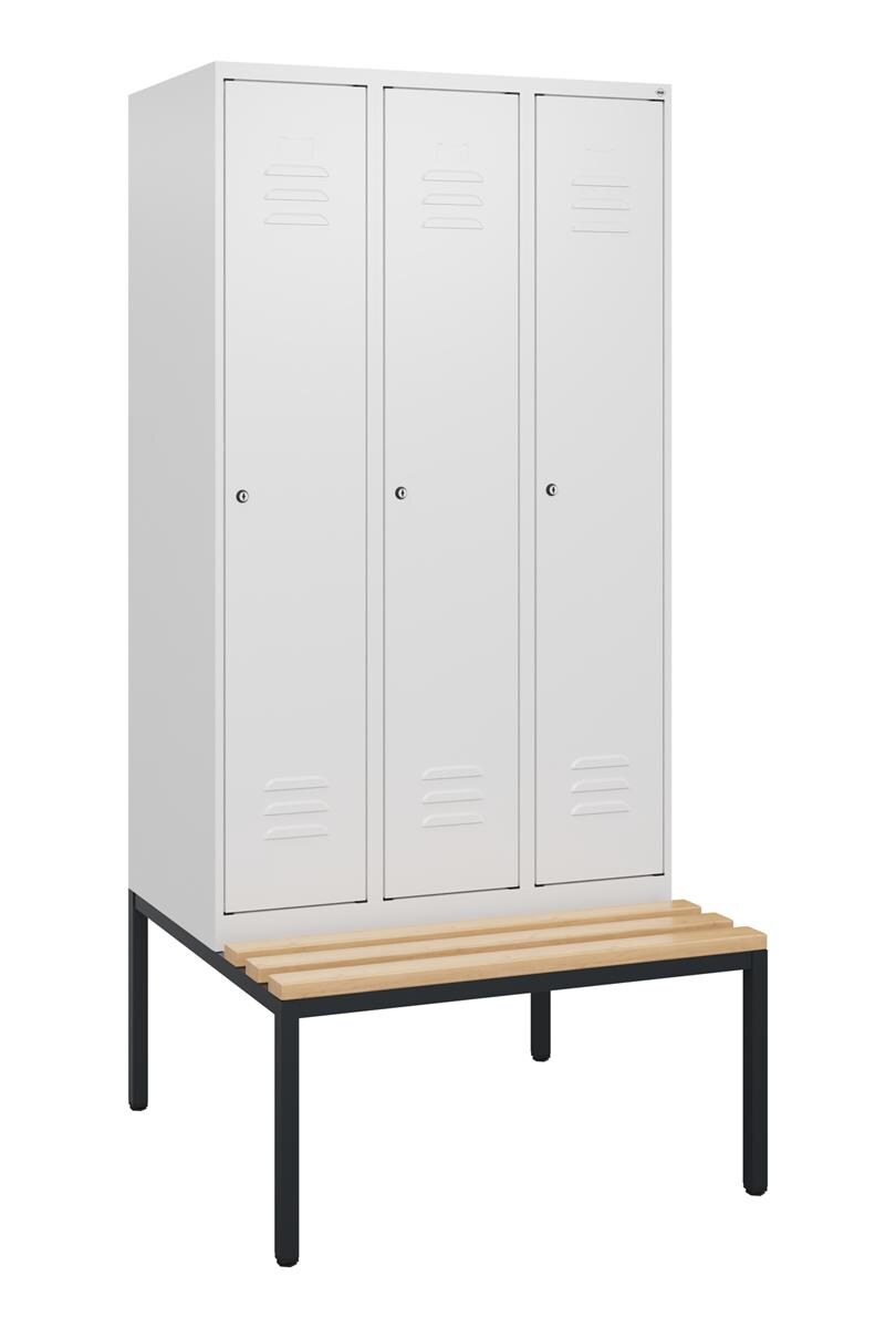 C+P Spind Classic PLUS, schwebender Sitzbank aus Buche 3 Abteile, HxBxT 212x120x82cm, Sicherheitsdrehriegel, Hellgrau/Enzianblau von PROREGAL