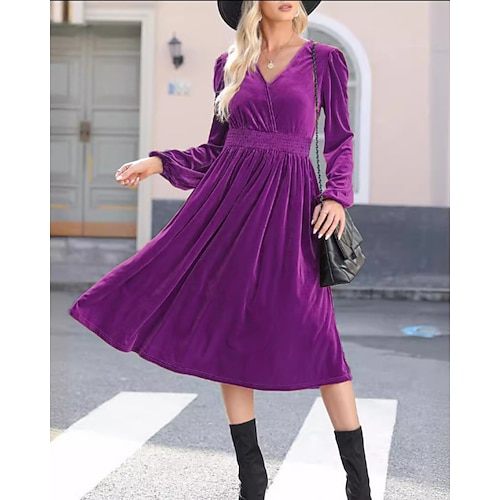 Per donna Abito Midi Abito arricciato Moderno Quotidiano All'aperto Uscire Vestibilità regolare Semplice Manica Lunga Scollo a V Nero Vino Viola Marrone Primavera Autunno