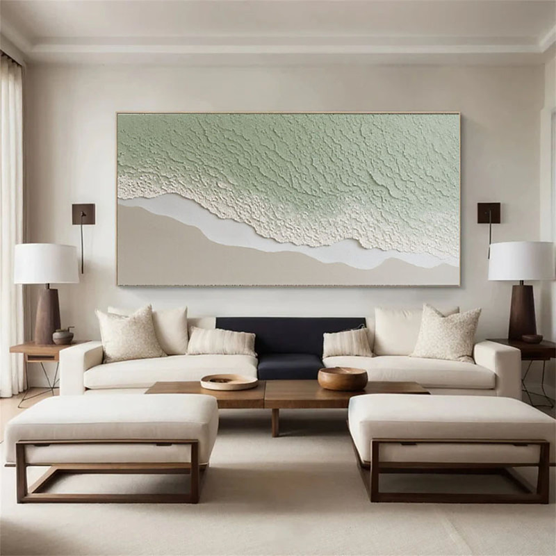 Hand painted Green Texture Sea oil painting handmade Wall Art Large Green Coastal Painting White Ocean Waves 3D Plaster Painting Minimalist Beach oil painting Wall Art painting Living Room Wall Art