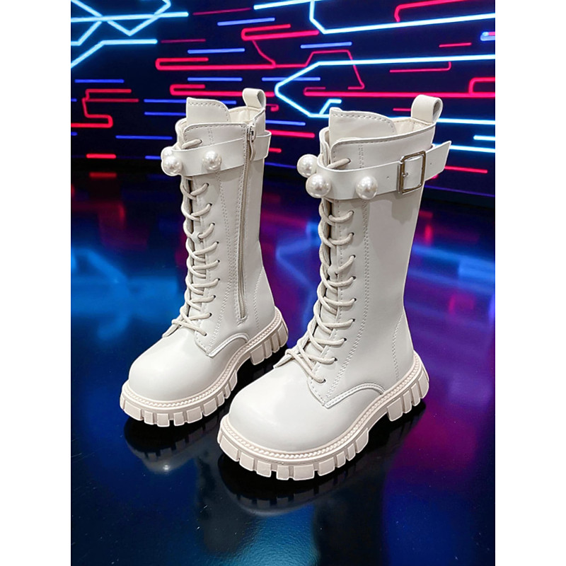 Korean Idol Inspired Pop Star Costume Shoes Girls' White Knee - High Lolita Boots, Pearl Bow Decor Low Heel Dress Boots for Girly Stylish Outfits