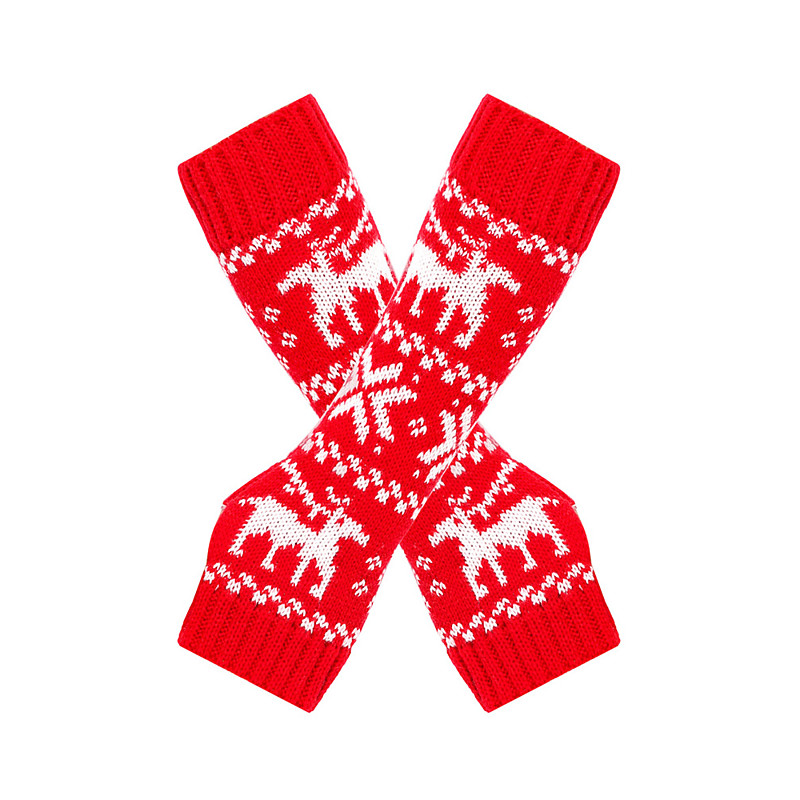 Women's Christmas Knit Fingerless Gloves, Red and White Fair Isle Reindeer Pattern, Holiday Gloves for Winter Parties and Festive Events