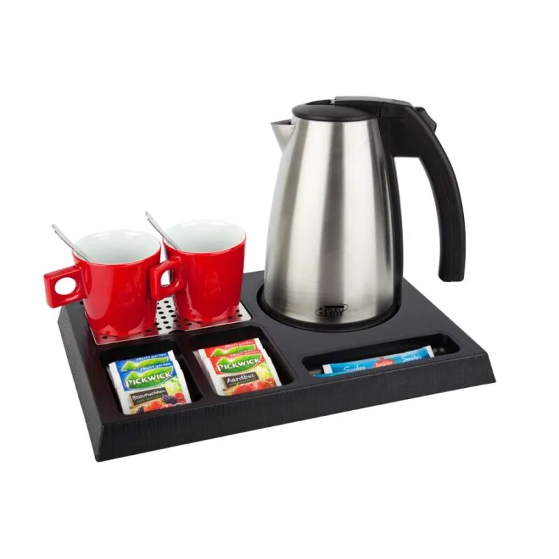 Willkommenstablett STAY Schwarz mit Wasserkocher STYLE 1,0 L Edelstahl und 2 rote Porzellantassen