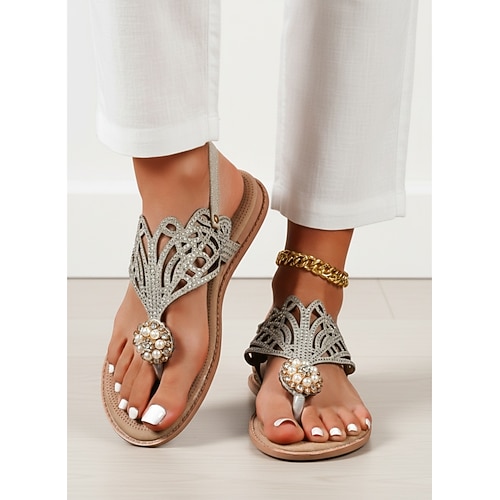 Sandali da donna bohémien beige - scarpe da passeggio con cinturino a T e strass scintillanti, con comodo cinturino elastico sul retro, ideali per vacanze all'aria aperta e resort al mare. viaggi