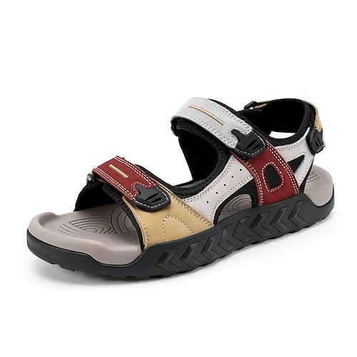 Sandali sportivi da uomo beige e bordeaux, aperti in punta, regolabili, scarpe da passeggio leggere e comode per l'estate, ideali per viaggi, escursioni, vacanze al mare e attività all'aperto.