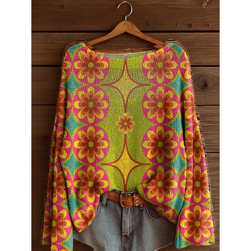 Women's Sweater Casual Soft Floral Graphic Ribbed Boat Neck Floral Knitted Print Long Sleeve Regular Tops Knit Outdoor Daily Weekend Yellow Pink Spring Fall
