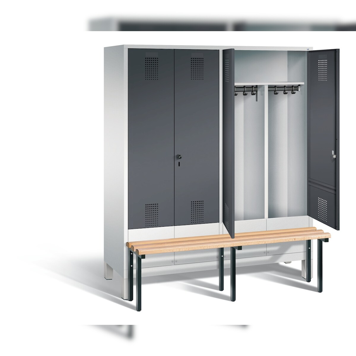 Doppelstock-Spind Classic PLUS Sitzbank, 3 Abteile, lichtgrau, B 1200 mm, Sicherheits-Drehriegel, auskragend, Buche-Hartholz C+P