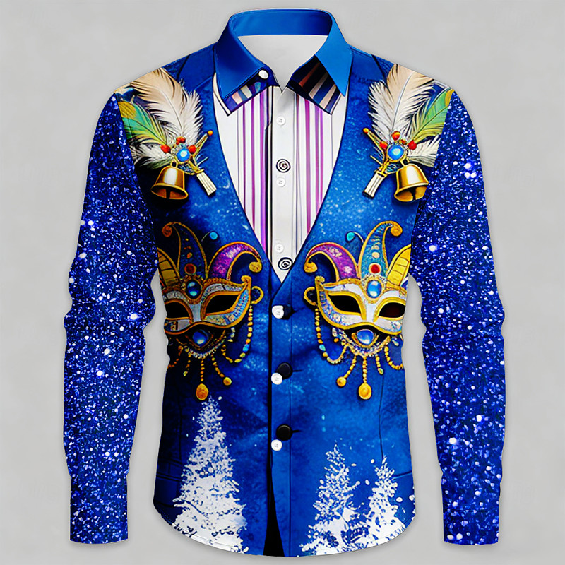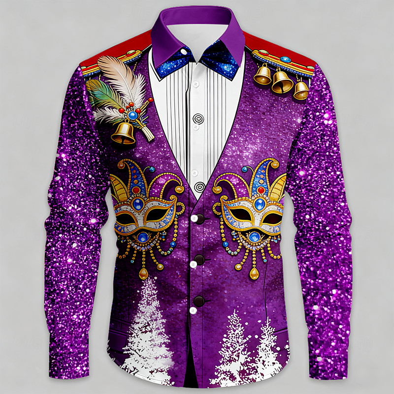 Mardi Gras Men's Carnival Faux Collar and Suit Design Mask with Feathers Shirt Button Up Shirt Long Sleeve Fashion Casual Party Holiday Spring Fall Turndown 3D Print Collared Shirts Blue Purple