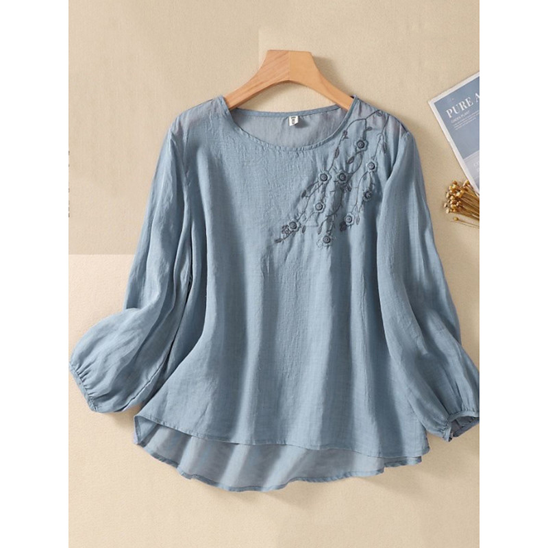 Women's Shirt Cotton Linen Shirts Blouse Floral Stylish Casual Long Sleeve Crew Neck Regular Tops Daily Embroidered Blue White Army Green Red Summer Spring Fall