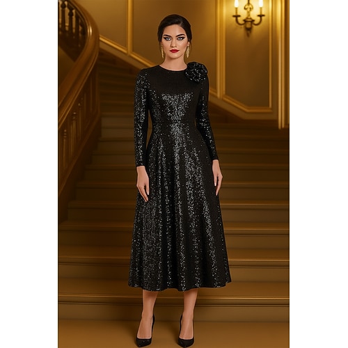 Linea ad A Lunghezza Tè Abiti da Cocktail Abiti da festa Elegante Manica Lunga Girocollo Festa in giardino Matrimonio Con Paillettes con Fiore sulla Spalla