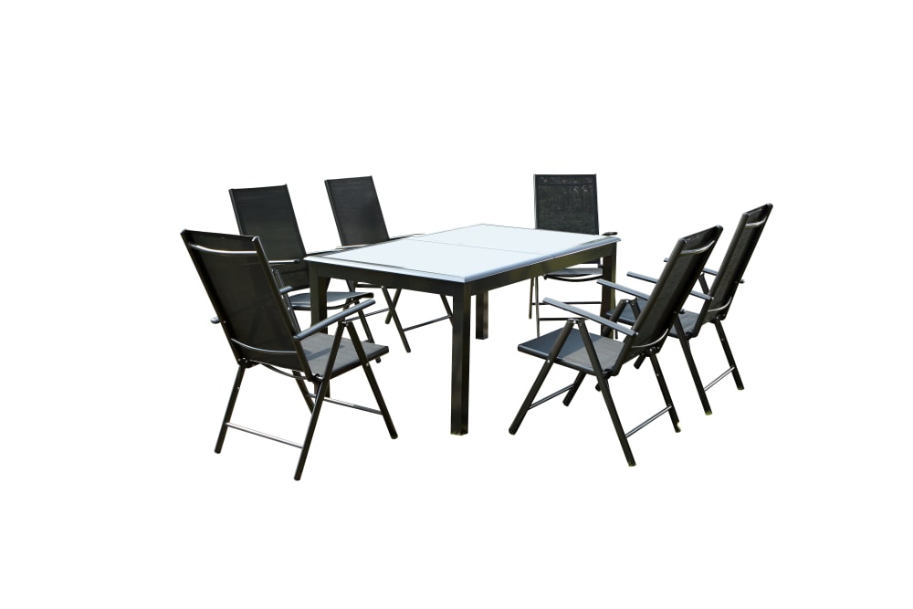 Outsunny Set da giardino esterno per 6 persone, telaio in alluminio, tavolo 140 cm, 6 sedie pieghevoli e reclinabili, nero