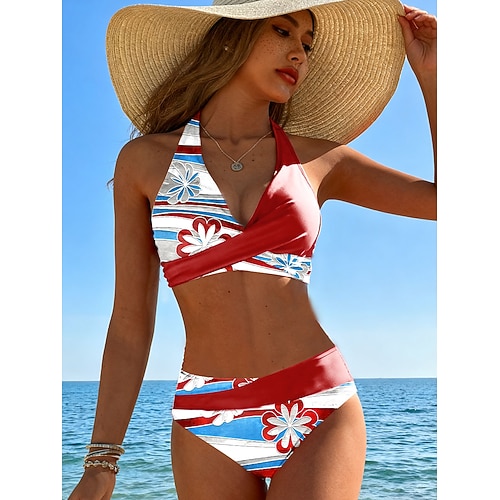 Costume da bagno da donna Bikini 2 pezzi Cheeky Moda Vacanza Grafica floreale V collo Senza maniche