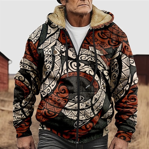 Per uomo Grafico Felpa con Cappuccio Giacca di pelle Moda Etnico Casual Manica Lunga Con Cappuccio All'aperto Sport all'Aperto Uscire Marrone chiaro Bianco Arancione Marrone Tasca Stampato Pile