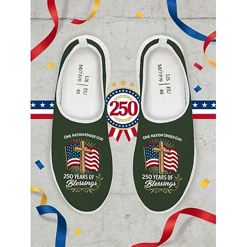 Sneakers slip-on blu patriottiche da donna: scarpe da passeggio leggere e traspiranti con bandiera americana e grafica per il 250° anniversario, ideali per il tempo libero, eventi festivi, viaggi e