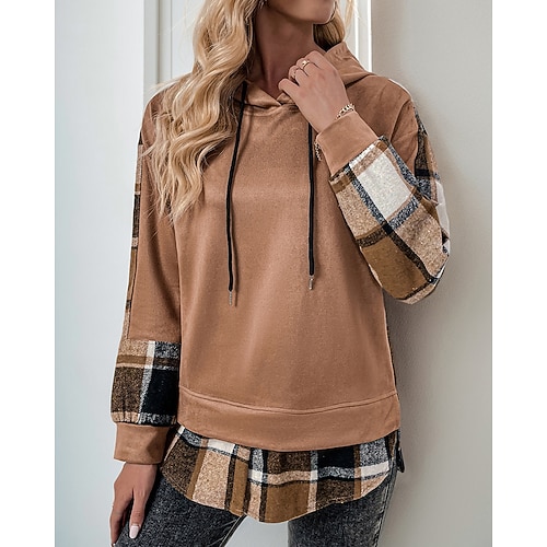 Per donna Felpa con cappuccio Plaid Vintage Casual Manica Lunga Con Cappuccio Top Regolari Streetwear Casuale Sportivo Coulisse Patchwork Rosa Verde militare Grigio scuro Beige Caffè Autunno Inverno