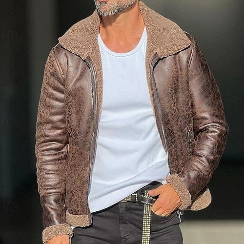 Per uomo Giacca in Ecopelle Giacca in Pile Giacca Sherpa Casual Quotidiano Caldo Pelliccia Inverno Primavera Autunno Colore Solido / Tinta Unita Casual Bavero Regolare Caffè scuro Giacca