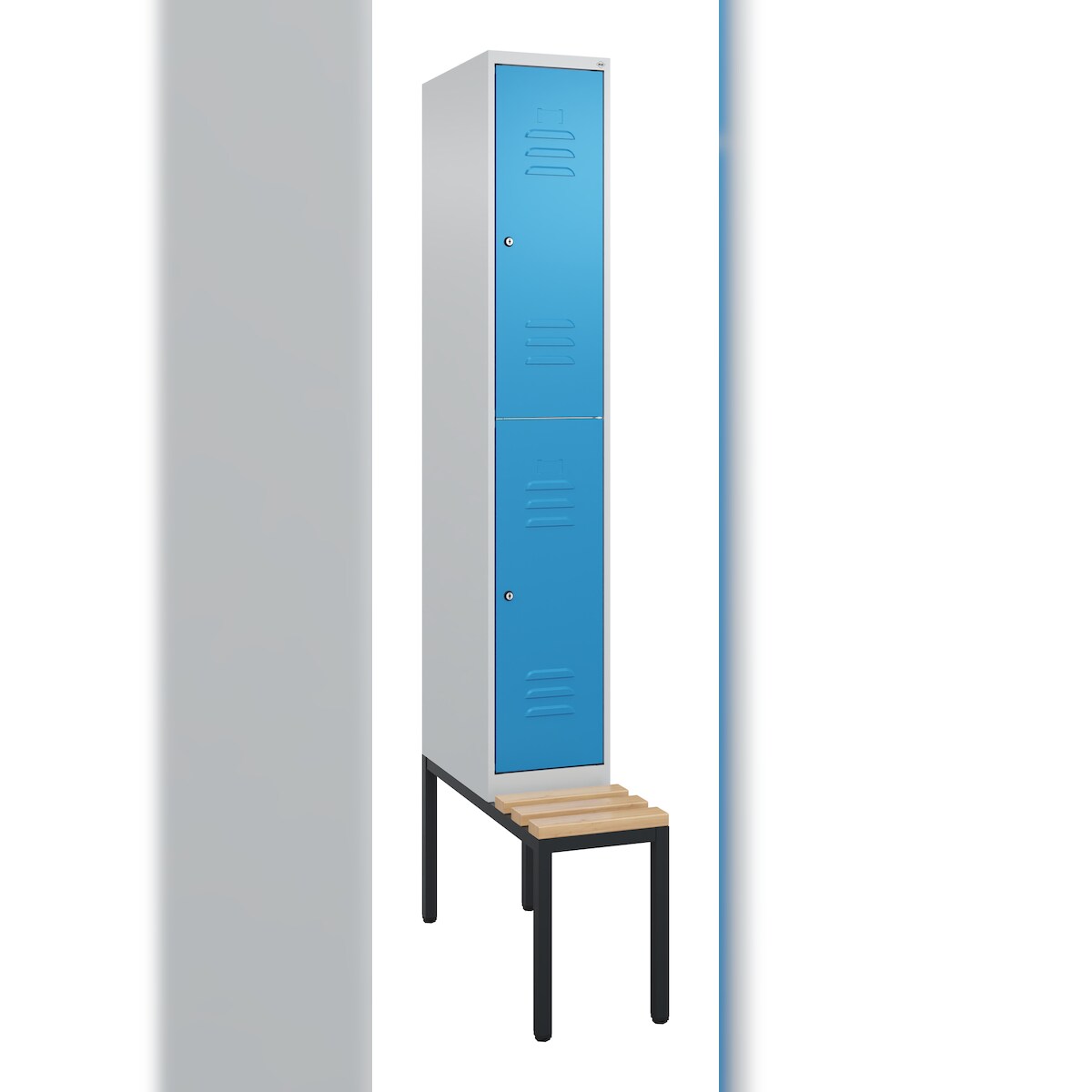 C+P Spind Classic PLUS, Buche untergebaute Sitzbank-Harthol, 2 Abteile, HxBxT 212x30x82cm, Zylinderschloss, Hellgrau/Lichtblau von PROREGAL