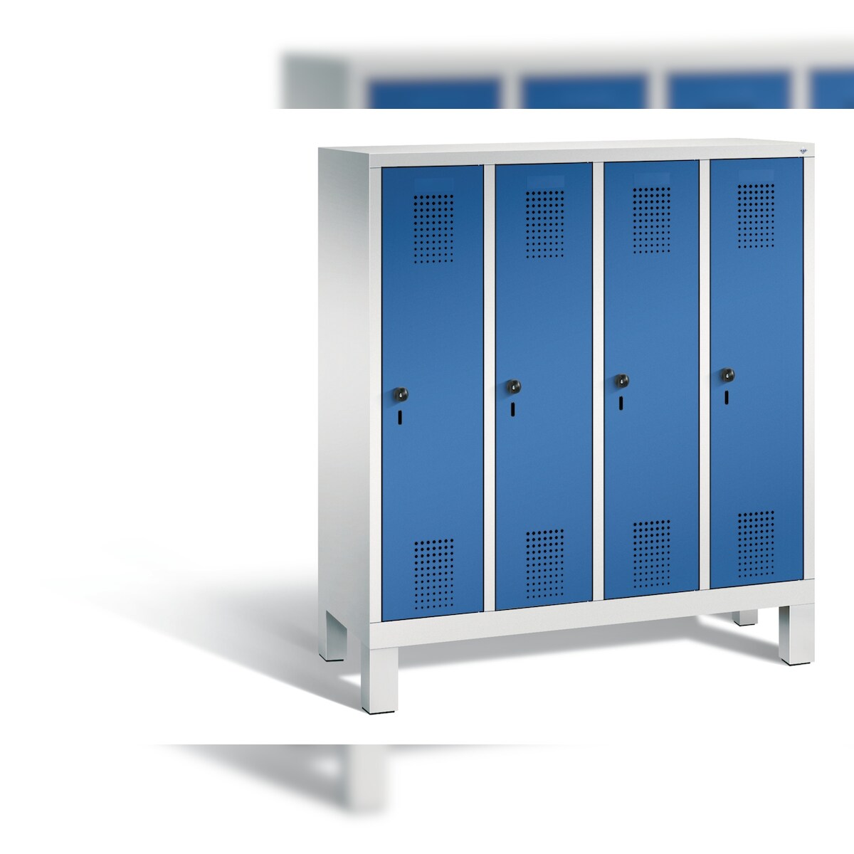 Spind Classic PLUS, 4 Abteile, lichtgrau / lichtblau, B 1200 mm, mit Bodensockel, Zylinderschloss C+P