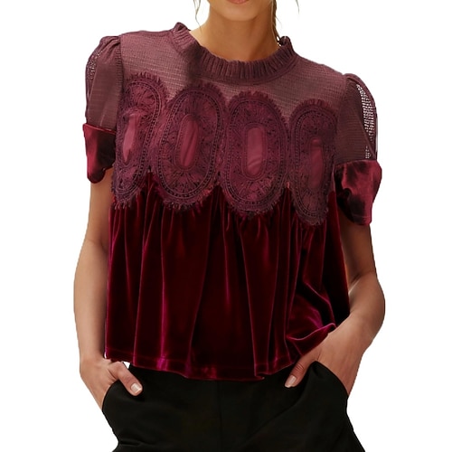 Per donna Velluto Blusa Tinta unica Elegante Manica Corta Girocollo Top Regolari Quotidiano Ferie Uscire Rete Blu Nero Vino Verde militare Arancione Estate Primavera