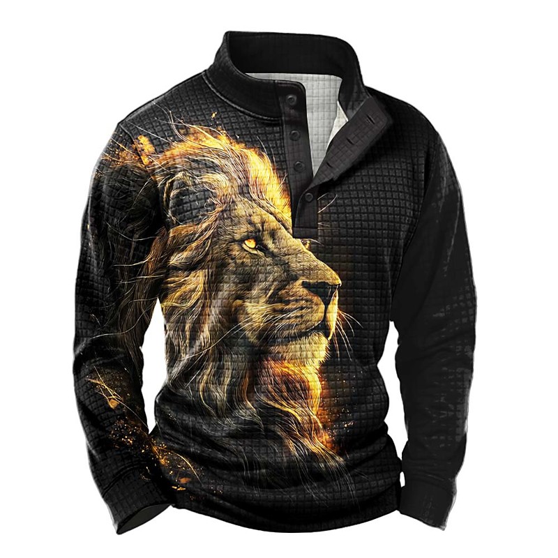 Men's Lion Waffle Sweatshirt Daily Classic Casual Stand Collar Outdoor Home Work Gift Black Buttons Fall Winter Designer S M L XL XXL XXXL