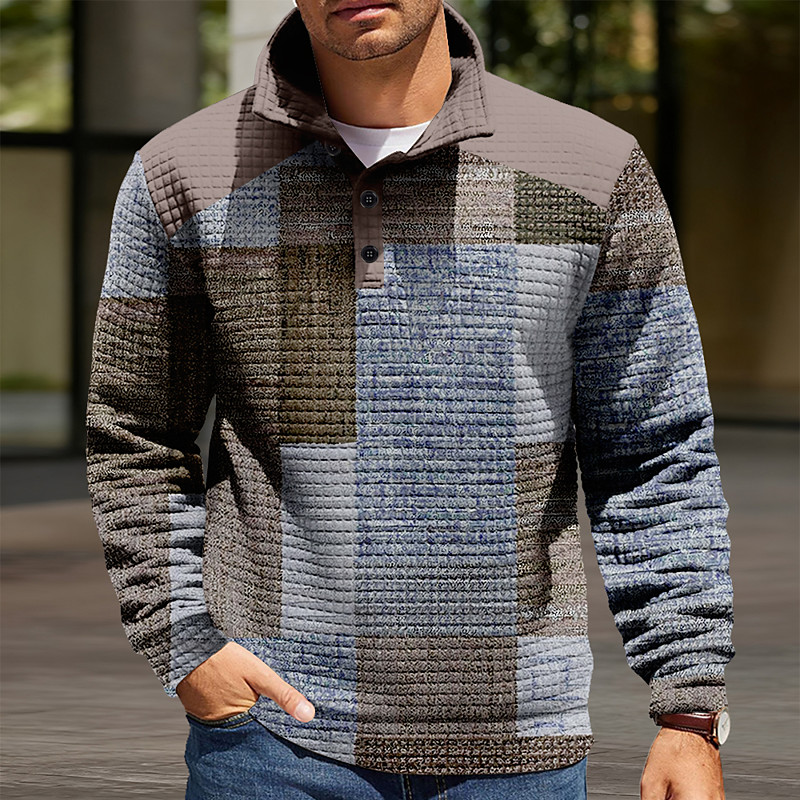 Men's Geometric Plaid Waffle Sweatshirt Daily Classic Casual Stand Collar Outdoor Home Work Gift Blue Yellow Purple Gray Buttons Fall Winter Designer S M L XL XXL XXXL