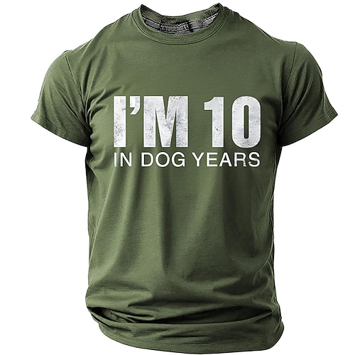 Herren-T-Shirt mit Aufdruck „Ich bin 10 in Hundejahren", abgenutztes Weiß, große, fette Buchstaben, humorvoll, sarkastisch, Gag-Geschenk, minimalistisch, Vintage, Grunge, normale Passform, lässig,