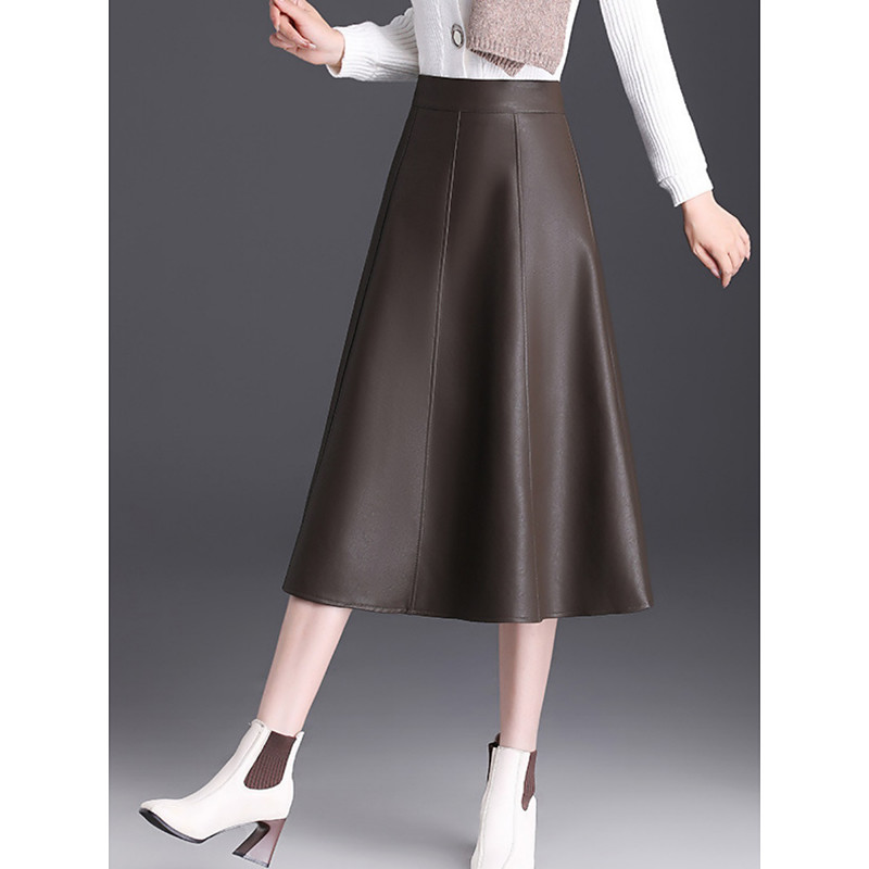 Women's Skirt A Line Elegant Fashion Casual Midi High Waist Skirts Plain Micro-elastic Street Daily Black Coffee Spring Faux Leather