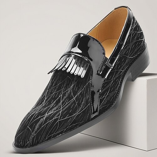 Mocassini eleganti da uomo in vera pelle nera verniciata di alta qualità, con punta affusolata e frange, perfetti per uomini d'affari, invitati a matrimoni, banchetti, feste e serate di lusso.