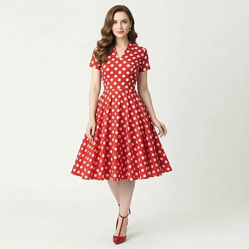 Retrò Vintage Anni 1950 Hepburn Midi Vestito Abito a trapezio Vestito Svasato Maniche corte Pois Aderente Svasato Costume Per donna Carnevale San Valentino Casuale Ritorno a casa Festa a tema retrò