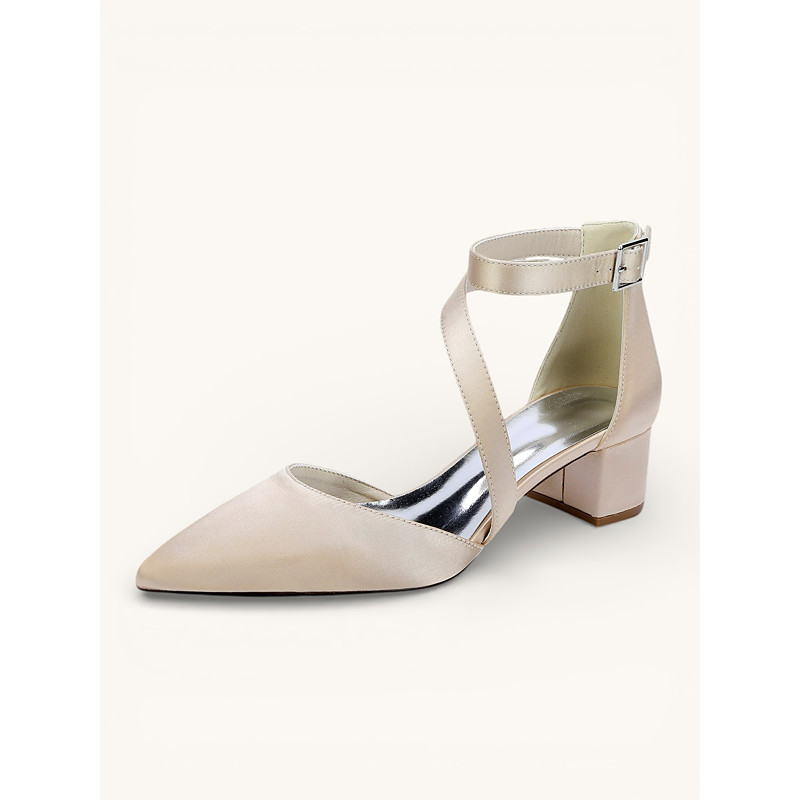 Women's Champagne Satin Block Heels - Pointed Toe Cross-Strap Dress Shoes with Ankle Buckle for Cocktail Parties and Semi-Formal Evenings