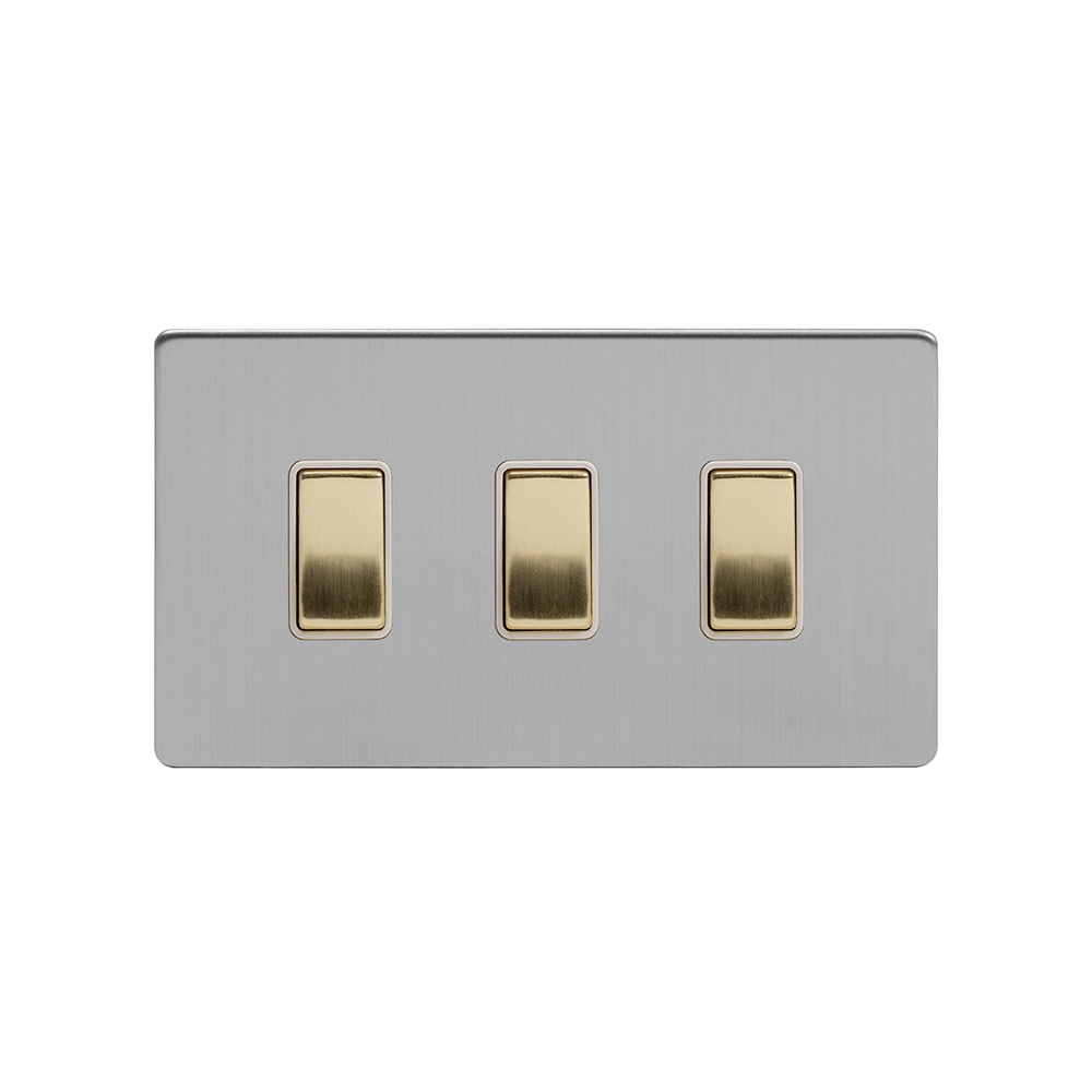 Soho Lighting Brushed Chrome & Brushed Brass 10A 3 Gang Switch on Double Plate 2 Way Screwless - Size: H 86mm X W 146mm