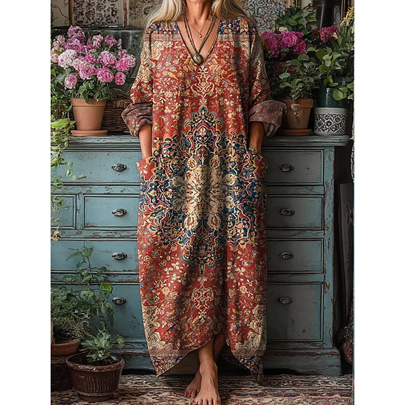 Women's Midi Dress A Line Dress Vacation Casual Daily Loose Fit Floral Graphic Long Sleeve V Neck Blue Red Green Spring Fall