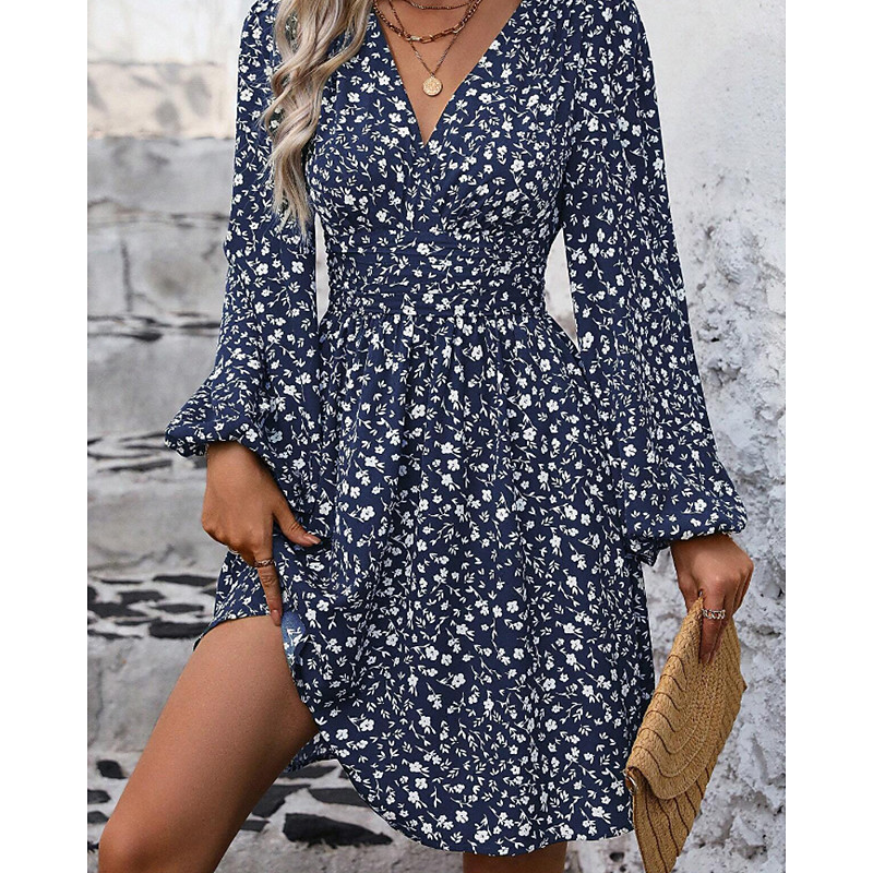 Women's Mini Dress Floral Dress Print Dress Classic Modern Daily Holiday Going out Regular Fit Plain Long Sleeve V Neck Blue Black Spring Fall