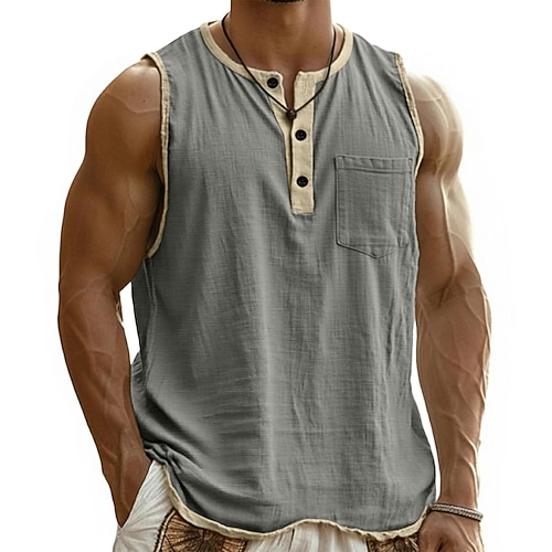 Herren Leinenhemd Tank Top Weste Unterhemd Ärmellos Henley Sommer Frühling Einfach Mode Designer Basic Tasche Knöpfe Lässig Urlaub Straße Schwarz Rosa Marineblau Top T-Shirt für Herren