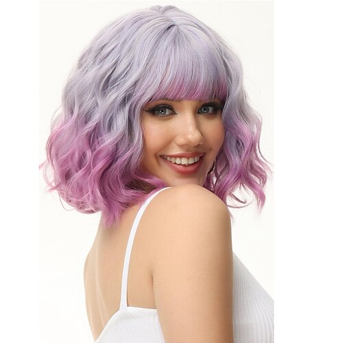 parrucca bob ondulata viola verde rosa con frangia parrucca viola ombre naturale capelli sintetici lunghezza delle spalle parrucche corte ricci per le donne
