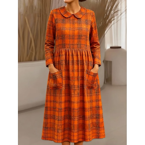 Per donna Abito Midi Tubino Abito Pieghettato Vacanza Casual Boho Ferie Abito Primaverile Vestibilità regolare Plaid Manica Lunga Girocollo Arancione Primavera Autunno